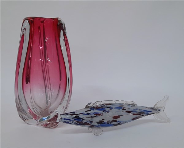 Lotto composto da un vaso in cristallo incolore trasparente e vinaccia firmato a punta sotto la base "Val Saint Lambert" unito a una scultura a tutto tondo in vetro incamiciato trasparente e policromo. Secolo XX. (h max cm 36) (lievi difetti)