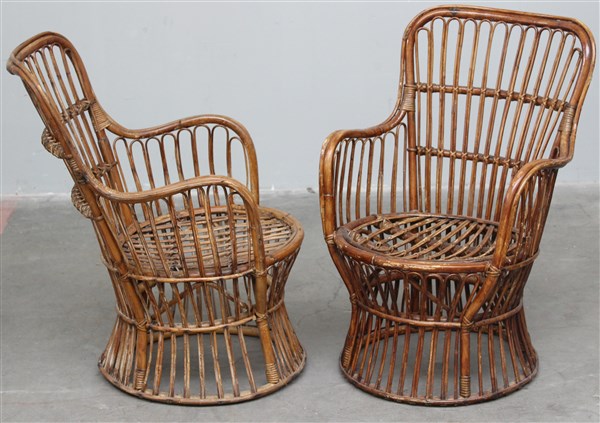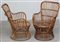 Coppia di poltroncine con struttura in giunco, malacca e scortecciato. Italia,