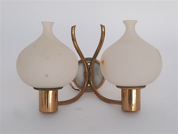 Lampada da parete a due luci con struttura in ottone, paralumi in vetro incamiciato lattimo. Italia, anni '50. (h cm 23,5) (lievi difetti)