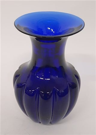 Vaso in vetro massello costolato blu. Murano, anni '70. Firmato a punta sotto la base. (h cm 22) (lievi difetti)