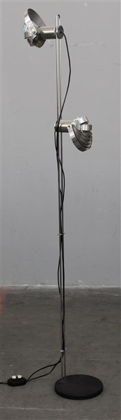Lampada da terra a due luci. Svizzera, anni '70. Base in ghisa, fusto in acciaio e portalampadine in alluminio con diffusori a lamine mobili curvate. Recante etichetta della produzione. (h cm 150)