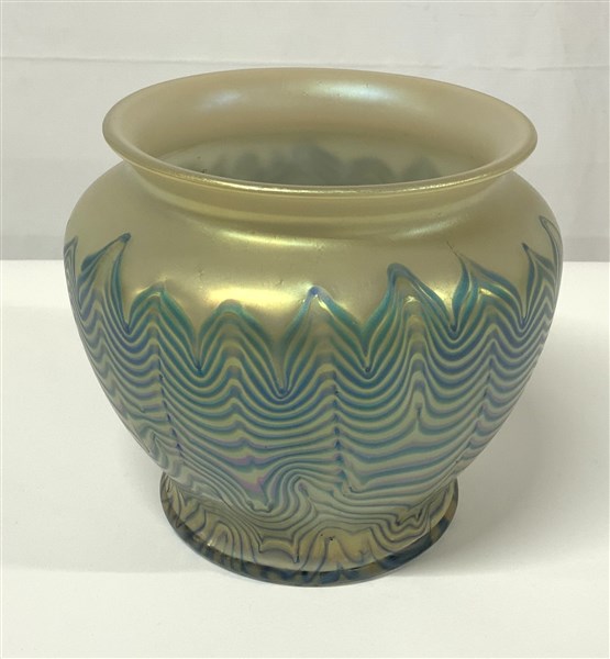 Vaso in vetro soffiato iridato e decorato con motivi fenici. Secolo XX. (h cm 16)