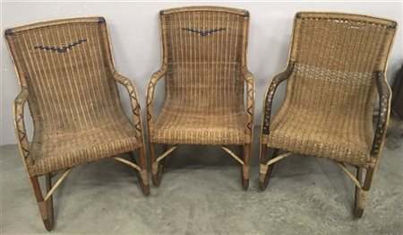 Lotto composto da tre poltroncine da veranda in rattan. Italia, anni '50/'60. (cm 52,5x84x57) (difetti e restauri)