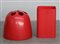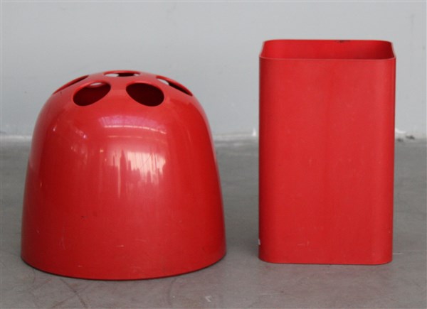 Lotto composto da un cestino e un portaombrelli modello "Dedalo" di Emma Gismondi Schweinberger per Artemide in plastica rossa. Italia, anni '70. (cestino cm 25x38x25; portaombrelli h cm 34, d cm 38) (lievi difetti)