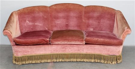 Divano a tre posti di forma curva imbottito e rivestito in velluto rosso, piedini in legno massello troncoconici. Italia, anni '50. (cm 205x89x80) (difetti)