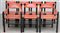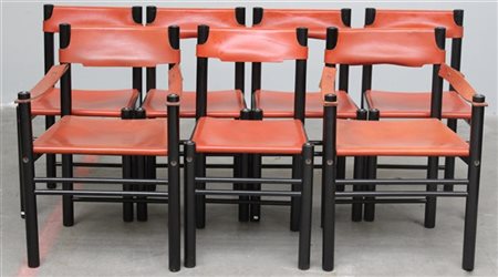 Lotto composto da cinque sedie e due poltroncine. Italia, 1972. Struttura in legno verniciato nero, seduta e schienale in cuoio color terra di Siena. Recanti etichetta adesiva del produttore sotto la seduta. (sedie cm 44x78x50; poltroncine cm 55x78x50) (difetti)