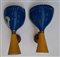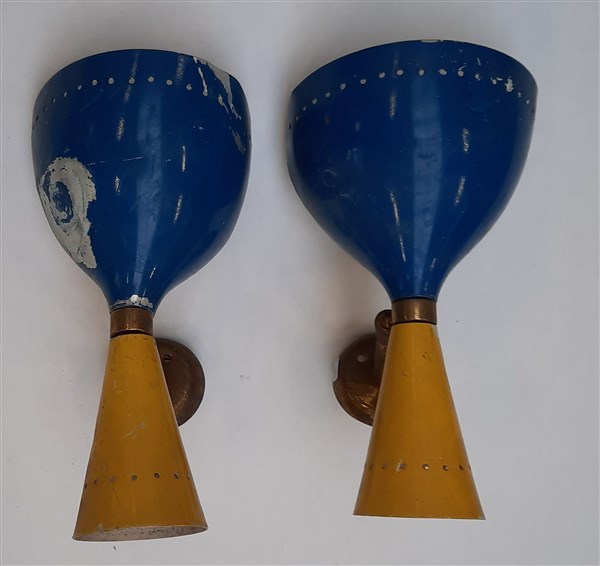 Coppia di lampade da parete con struttura in ottone, paralumi in metallo verniciato giallo e blu. Italia, anni '50. (h cm 26) (difetti)