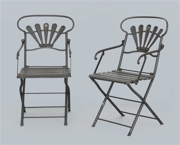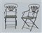 Coppia di poltroncine pieghevoli in ferro battuto verniciato grigio. Parabiago, prima metà secolo XX. Recante marchio del produttore sullo schienale. (cm 46x90x65) (difetti)