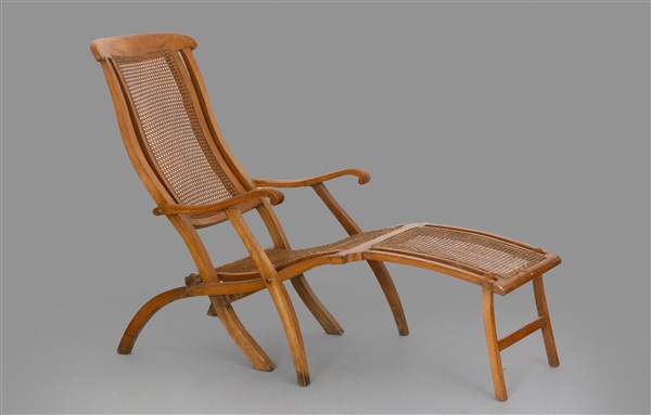 Sdraio pieghevole in legno con poggiapiedi estraibile, seduta e schienale in paglia di Vienna intrecciata. Italia, anni '40. (cm 53x93x135) (difetti)