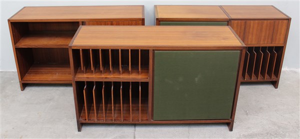Lotto di tre credenze in legno di cui due porta vinili con impianto stereo "Prodel Milano" incorporato e una con giradischi "Elac" e la terza con stipo ad anta e piani a giorno. Italia, anni '60. (cm 119,5x72x41) (difetti)