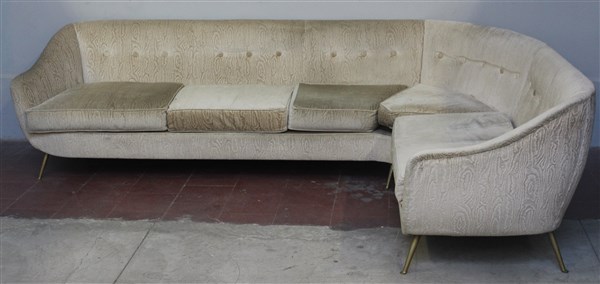 Divano angolare imbottito e rivestito in velluto bianco, piedini in ottone. Italia, anni '50. (cm 235x70x187) (difetti)
