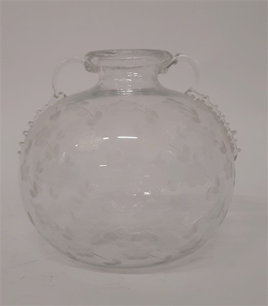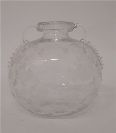 vaso biansato in vetro soffiato trasparente incolore con decori floreali alla mola. Italia, anni '50. (h cm 17)