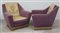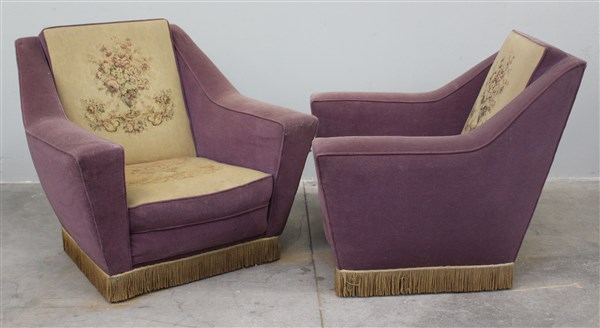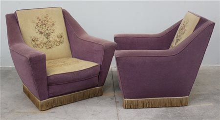 Coppia di poltrone con piedini troncoconici in legno massello, rivestimento in velluto viola, seduta e schienale con cuscini trapuntati con decori a fiori. Italia, anni '50. (cm 90x81x89) (difetti)