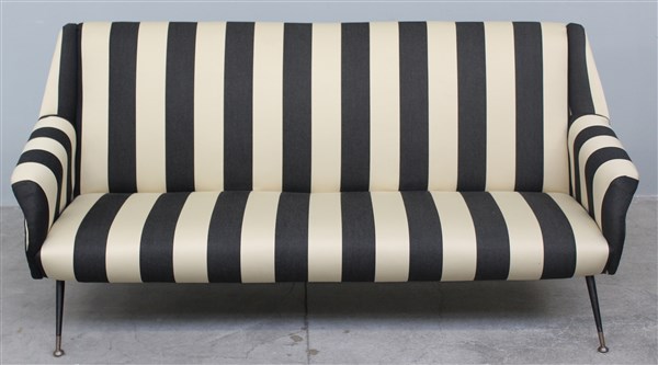 Divano a due posti in tessuto imbottito e rivestito in tessuto a righe créme e grigio, piedini in metallo verniciato nero e ottone. Italia, anni '60. (cm 175x80x66) (restauri)