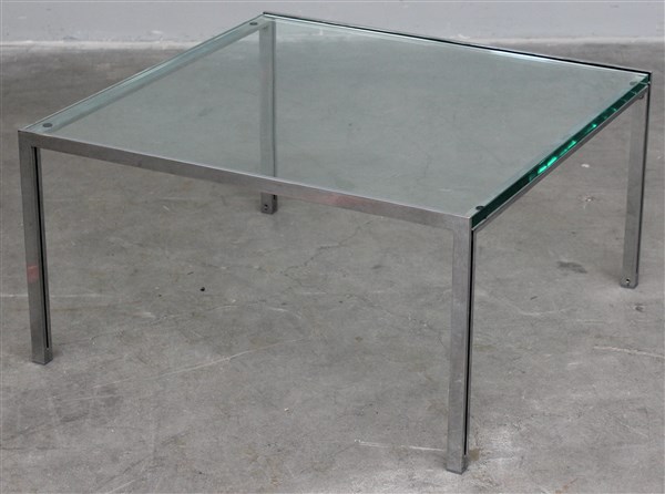 Tavolino da salotto. Produzione ICF, Italia, anni '70. Struttura in acciaio cromato e piano in cristallo molato di forte spessore. (cm 80x41,5x80) (lievi difetti)