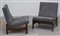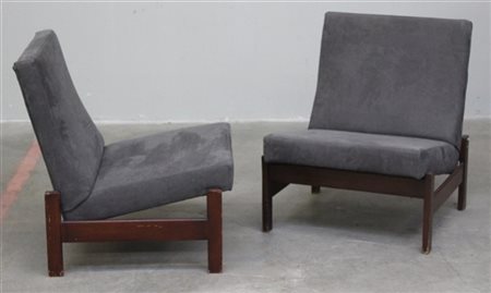 Coppia di poltrone con struttura in legno, seduta e schienale imbottiti e rivestiti in alcantara grigia. Italia, anni '70. (cm 63x72x65) (lievi difetti e restauri)