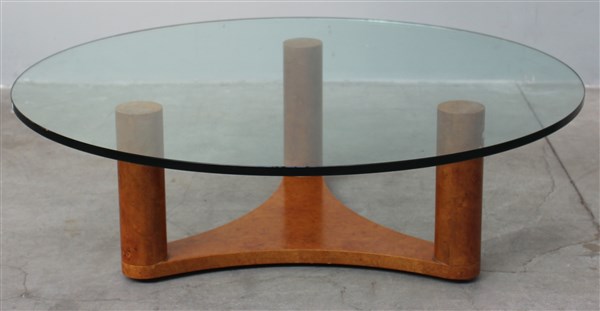 Tavolino da salotto con base tripode in legno impiallacciato in radica, piano circolare in cristallo. Italia, anni '80/'90. (h cm 30,5; d cm 100)