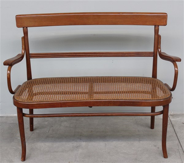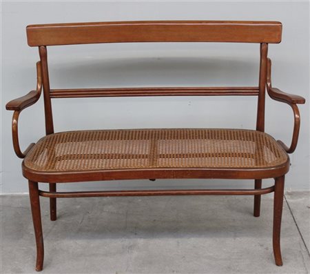 Divanetto modello "3108-FR 45". Austria, anni '40. Legno di faggio curvato al vapore e seduta in paglia di Vienna. Marcato a fuoco e con etichetta cartacea. (cm 123x94x55) (lievi difetti)