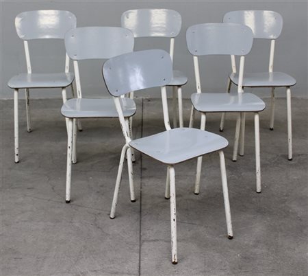 Lotto di sei sedie in acciaio verniciato bianco, seduta e schienale in compensato rivestito in formica azzurra. Italia, anni '50. (cm 36,5x77x40) (difetti)