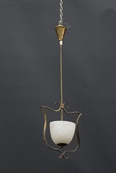 Lampada a sospensione con struttura in ottone, coppa diffusore in vetro soffiato a reticello lattimo. Italia, anni '50. (h cm 97) (lievi difetti)