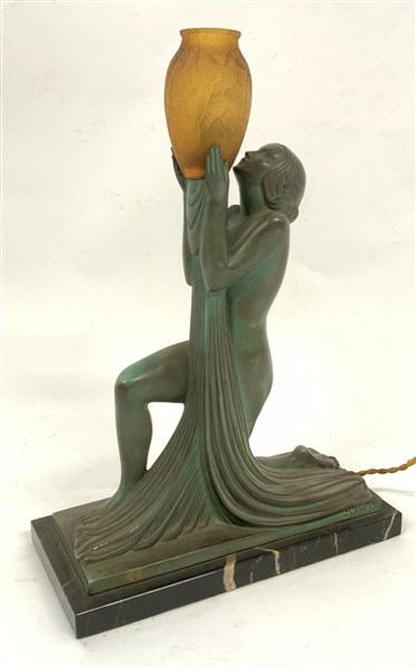 Lampada da tavolo-scultura in bronzo raffigurante vestale che regge un vaso in vetro soffiato corrugato color ambra, base in marmo nero venato. Francia, anni '20. Firma alla base. (cm 26x37,5x12)