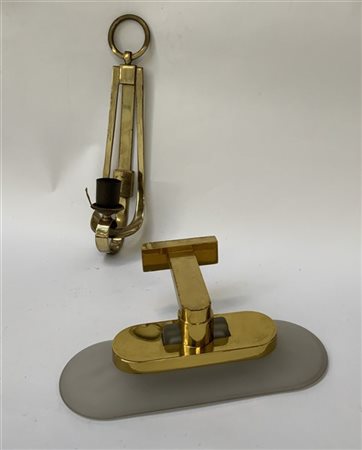 Lotto composto da una lampada da parete con struttura in ottone e paralume in vetro trasparente incolore acidato sulla superficie interna unita a una struttura per lampada da parete in ottone. Italia, secolo XX. (h max cm 46)