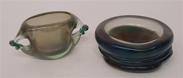 Coppetta biansata in vetro incamiciato trasparente verdino leggermente iridato unita a un posacenere in vetro massello iridescente nei toni del verde. Italia, anni '50. (h cm 6,5; d cm 16) (lievi difetti). Italia, anni '50/'60. (coppetta cm 16,5x8; posacenere cm 6,5x16)