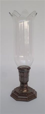 Candeliere della serie "Gallia". Francia, secolo XX. Base in metallo argentato, paralume in vetro trasparente incolore. Marcato alla base. (h cm 40,5)