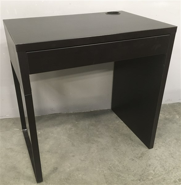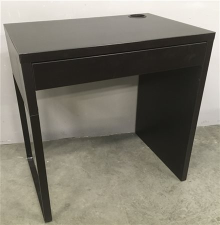 Piccola scrivania con cassetto sottopiano in truciolato impiallacciato e metallo verniciato nero. Italia, produzione recente. (cm 73x75x50) (lievi difetti)
