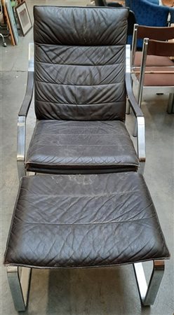 Poltrona con pouf modello "D250 KOMET". Produzione Dreipunkt, Germania, anni '70. Struttura in acciaio cromato, cuscini e braccioli in pelle marrone. Nome del produttore stampato sul tessuto. (poltrona cm 67x98x80; pouf cm 60x40x45) (difetti)