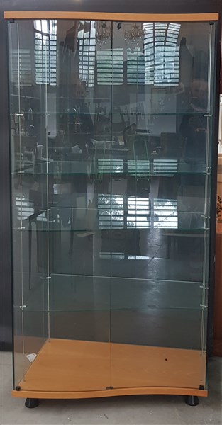 Vetrina di forma mossa con quattro mensole in cristallo molato. Base e sommità in legno impiallacciato chiaro, piedini in legno nero verniciato. Italia, anni '90. (cm 91x182x53) (lievi difetti)