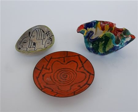 Lotto composto da due svuotatasche in ceramica policroma uniti a un piattino in rame smaltato nei toni dell'arancio. Italia, secolo XX. (misure diverse) (lievi difetti)