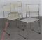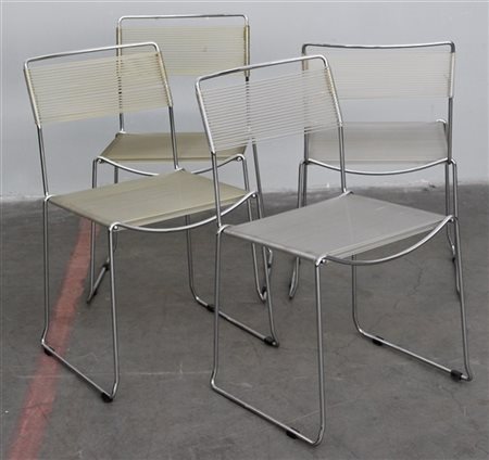 Gruppo di quattro sedie in metallo cromato, seduta e schienale in pvc trasparente incolore. Italia, anni '70. (cm 44,5x80x52) (lievi difetti)