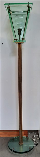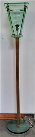 Lampada da terra con fusto in ottone scanalato, base e paralumi in cristallo molato. Italia, anni '40/'50. (h cm 185) (difetti)