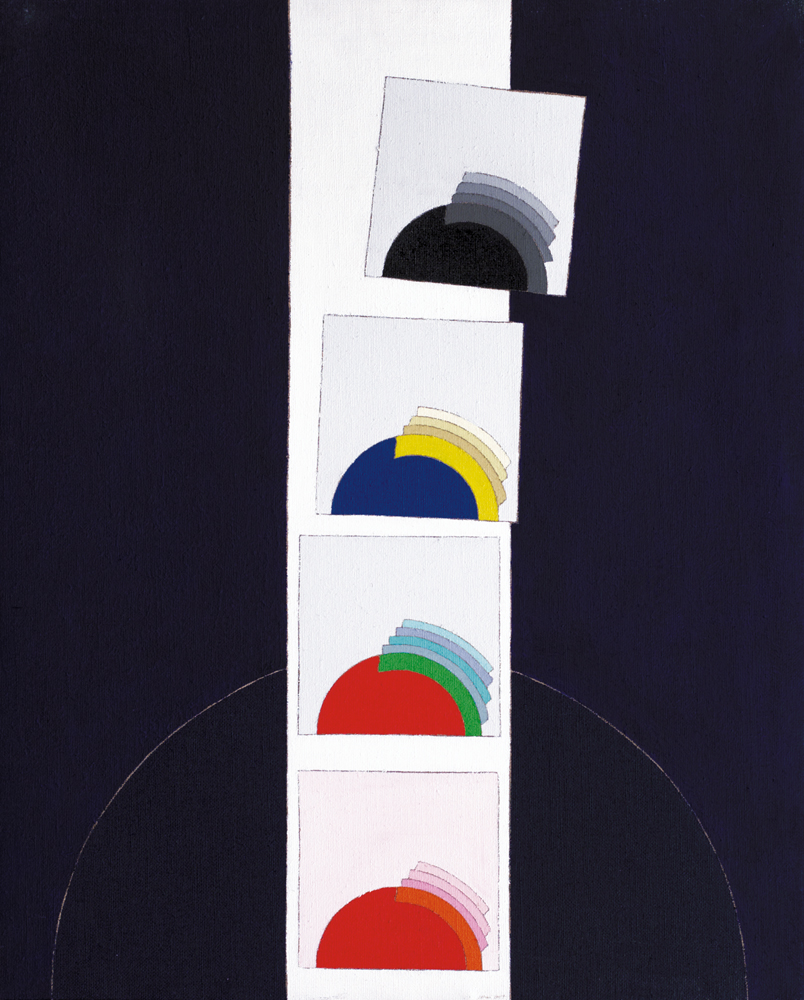 EUGENIO CARMI Genova 17/02/1920 Fra passato e futuro, 2007 olio su tela cm. 100x80, firma e anno in basso al centro, titolo, firma e anno al retro, dichiarazione d'autenticità dell'artista su foto.