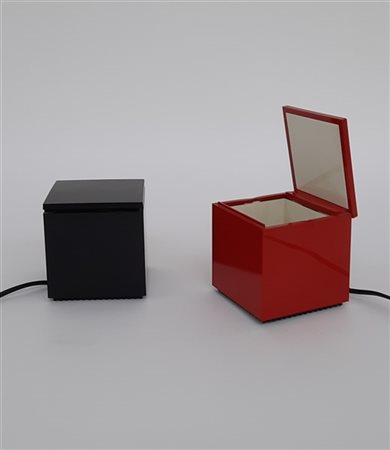 Coppia di lampade da tavolo modello "Cuboluce". Produzione Cini & Nils, Milano, 1972. Struttura in tecnopolimero nero e rosso. Recanti marchio del produttore sotto la base. (cm 10x10,5x10) (lievi difetti)