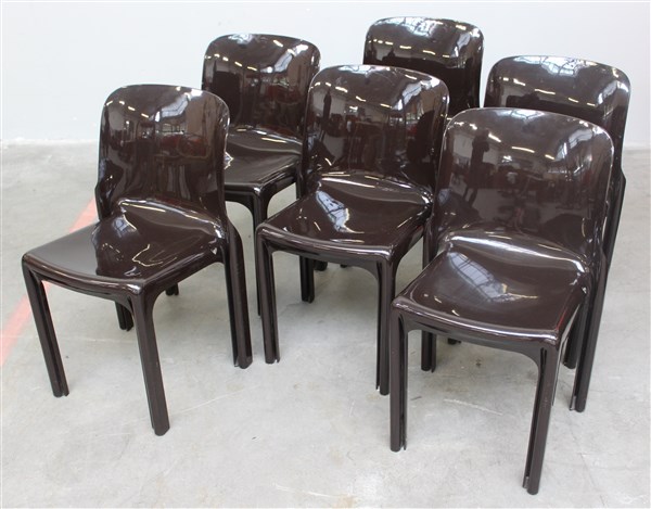 Gruppo di sei sedie modello "Selene". Produzione Artemide, Milano, 1969. Plastica marrone. Marcate sotto la seduta. (cm 46,5x75,5x37,5) (lievi difetti)