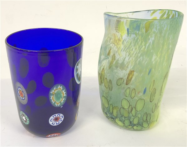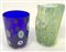 Lotto composto da un vasetto in vetro soffiato trasparente blu con inclusione di murrine policrome unito a un vasetto in vetro soffiato trasparente azzurrino con inclusione di murrine verdi e gialle. Murano, produzione recente. Firmati a punta sotto la base e recanti etichette adesive. (h max cm 15)
