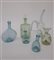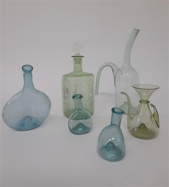 Lotto composto da due oliere, una bottiglia esagonale con tappo, tre vasetti in vetro trasparente incolore, azzurrino e verde. Italia, secolo XX. (misure diverse) (lievi difetti)