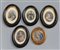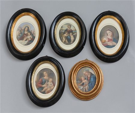 Gruppo di cinque miniature su avoriolina raffiguranti la Madonna col Bambino ( h max cm 8,5), in cornici ovali (difetti)