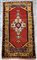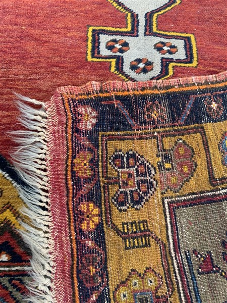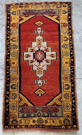 Tappeto Konia, Anatolia, inizio Secolo XX. Decoro con medaglione a fondo beige su fondo rosso. (Difetti, vecchi restauri) (cm 180x94)
