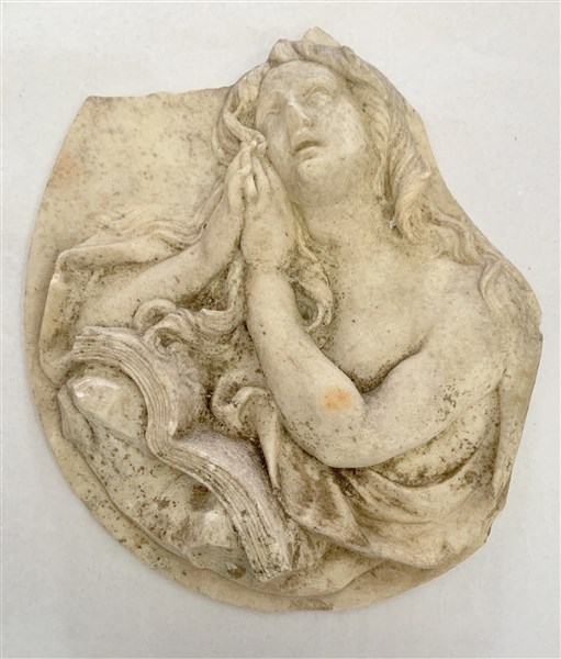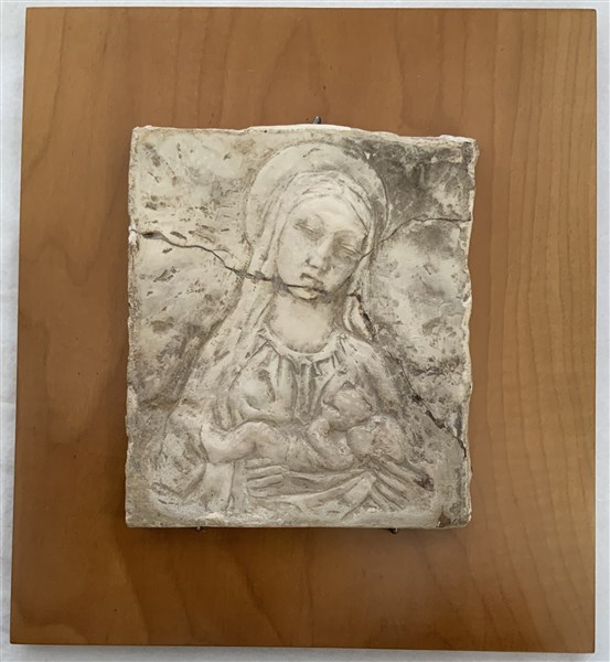 Lotto composto da due bassorilievi in marmo raffiguranti la Madonna che allatta (cm max 21x27) con supporto in legno, ed un altorilievo in marmo raffigurante una Santa in estasi (cm 29x33) (difetti e mancanze)