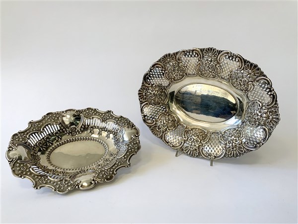 Lotto composto da due svuotatasche in argento con tese traforate e cesellate a cartelle, volute e motivi fioriti. Punzoni inglesi rispettivamente di Chester e Birmingham del secolo XX (g 530)