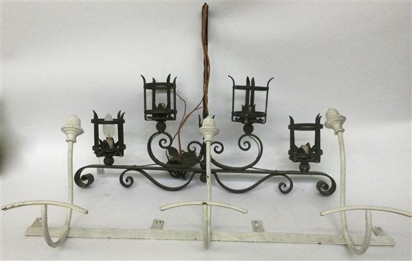Lotto composto da un lampadario a quattro luci in ferro battuto ed un attaccapanni in ferro verniciato bianco, misure diverse (difetti)