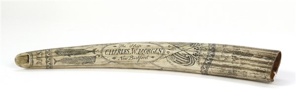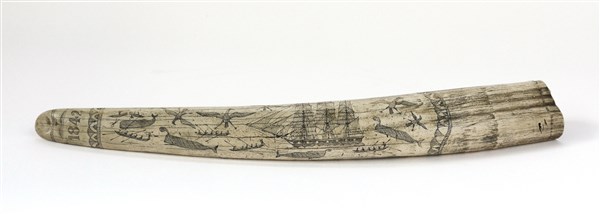 Zanna in resina a finto avorio inciso con scene di pesca alla balene e inscritt