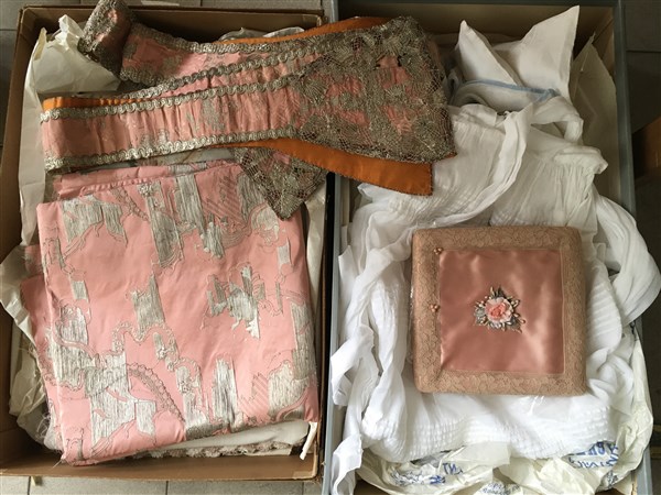 Lotto di due cartoni contenenti tessuti e vesti di varie fogge e dimensioni (di