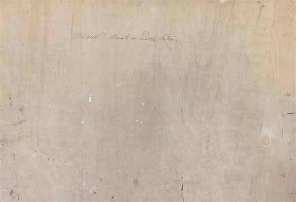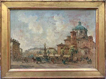 "Milano: mercato in Piazza Vetra" olio su compensato (cm 50x70) Firmato in basso a destra. Al retro: titolato. In cornice