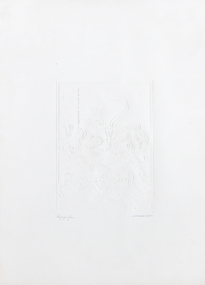 EZIO GRIBAUDO Torino 10/01/1929 Logogrifo, (1980) rilievo su carta Buvard cm. 62x46, firma e titolo in basso, etichetta dell'artista al retro.