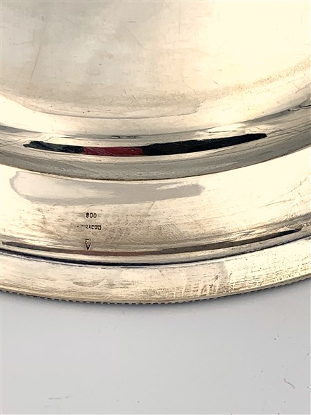 Piatto tondo in argento con bordo dentellato (d. cm 35) argentiere Miracoli, titolo 800 (g 900)