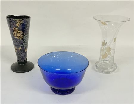 Manifatture diverse, lotto composto da due vasi di diversa forma e decoro in vetro lavorato uniti ad una coppa in vetro soffiato blu (difetti)